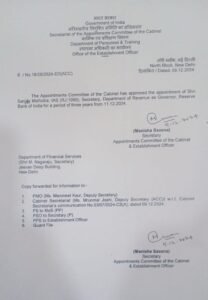 नई दिल्ली। संजय मल्होत्रा भारतीय रिजर्व बैंक (RBI) के 26वें गवर्नर के रूप में नियुक्त किए गए हैं। वह मौजूदा गवर्नर शक्तिकांत दास की जगह लेंगे, जिनका कार्यकाल 10 दिसंबर को समाप्त हो रहा है। मल्होत्रा फिलहाल रेवेन्यू सेक्रेटरी के पद पर कार्यरत हैं और उन्होंने बजट 2024 की तैयारी में अहम भूमिका निभाई थी। प्रधानमंत्री नरेंद्र मोदी के विश्वासपात्र नौकरशाहों में से एक, मल्होत्रा 11 दिसंबर से अपना कार्यभार संभालेंगे।