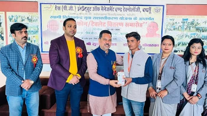 बदायूं। जिसमें तृतीय वर्ष के छात्राओं को स्मार्टफोन का वितरण किया गया कार्यक्रम का आरंभ मुख्य अतिथि राजीव गुप्ता जिला अध्यक्ष भाजपा बदायूं द्वारा मां शारदे के समक्ष दीप जलाकर कार्यक्रम को गति प्रदान की जिला अध्यक्ष जी ने उत्तर प्रदेश सरकार और भारत सरकार की उपलब्धि उपलब्धियों पर प्रकाश डाला सरकार द्वारा छात्र-छात्राओं को सशक्तिकरण हेतु यह योजना अत्यंत लाभकारी सिद्ध होगी इस अवसर पर महाविद्यालय प्रबंधन इंजीनियर रचित गोयल प्राचार्य डॉ मनोज श्रीवास्तव प्रशासनिक अधिकारी शक्ति बाबू कार्यालय नियंत्रक संदीप गुप्ता डॉक्टर अंशु श्रीवास्तव प्रभात सक्सैना विकास श्रीवास्तव अंजलि सक्सेना मुस्तफिज अनुज विजेंद्र पाल आदि समस्त स्टाफ उपस्थित रहा।