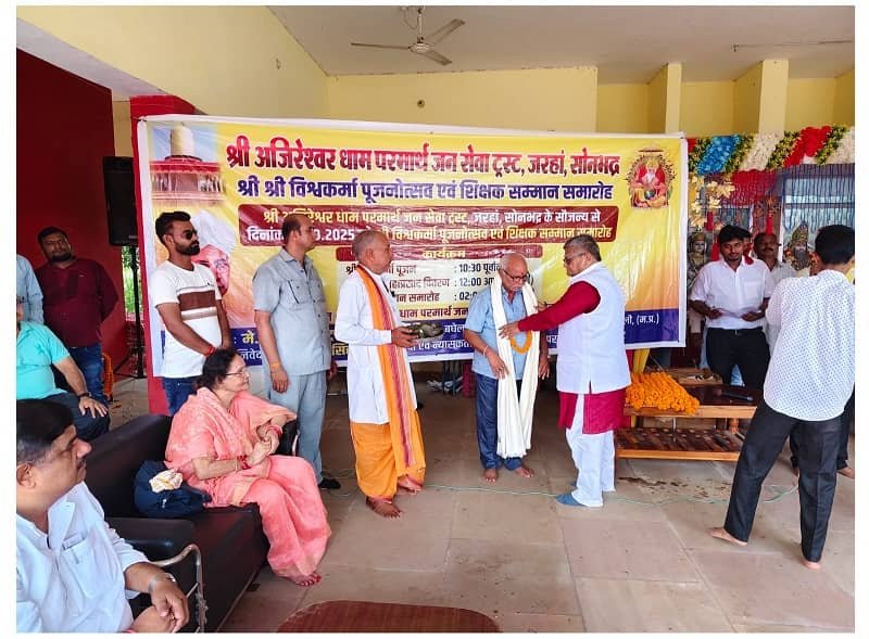 सोनभद्र (बीजपुर)। श्री अजीरेश्वर धाम परिसर, जरहा में बुधवार को शिक्षकों का भव्य सम्मान समारोह आयोजित किया गया। कार्यक्रम का आयोजन मे. बघेल इंफ्रास्ट्रक्चर प्रा. लि., विंध्यनगर (सिंगरौली, मध्यप्रदेश) के सौजन्य से किया गया। इस अवसर पर म्योरपुर, बभनी और दुद्धी ब्लॉकों से आए सेवानिवृत्त, परिषदीय विद्यालयों और इंटर कॉलेजों के शिक्षकों को तिलक, माल्यार्पण और अंगवस्त्र भेंट कर सम्मानित किया गया।