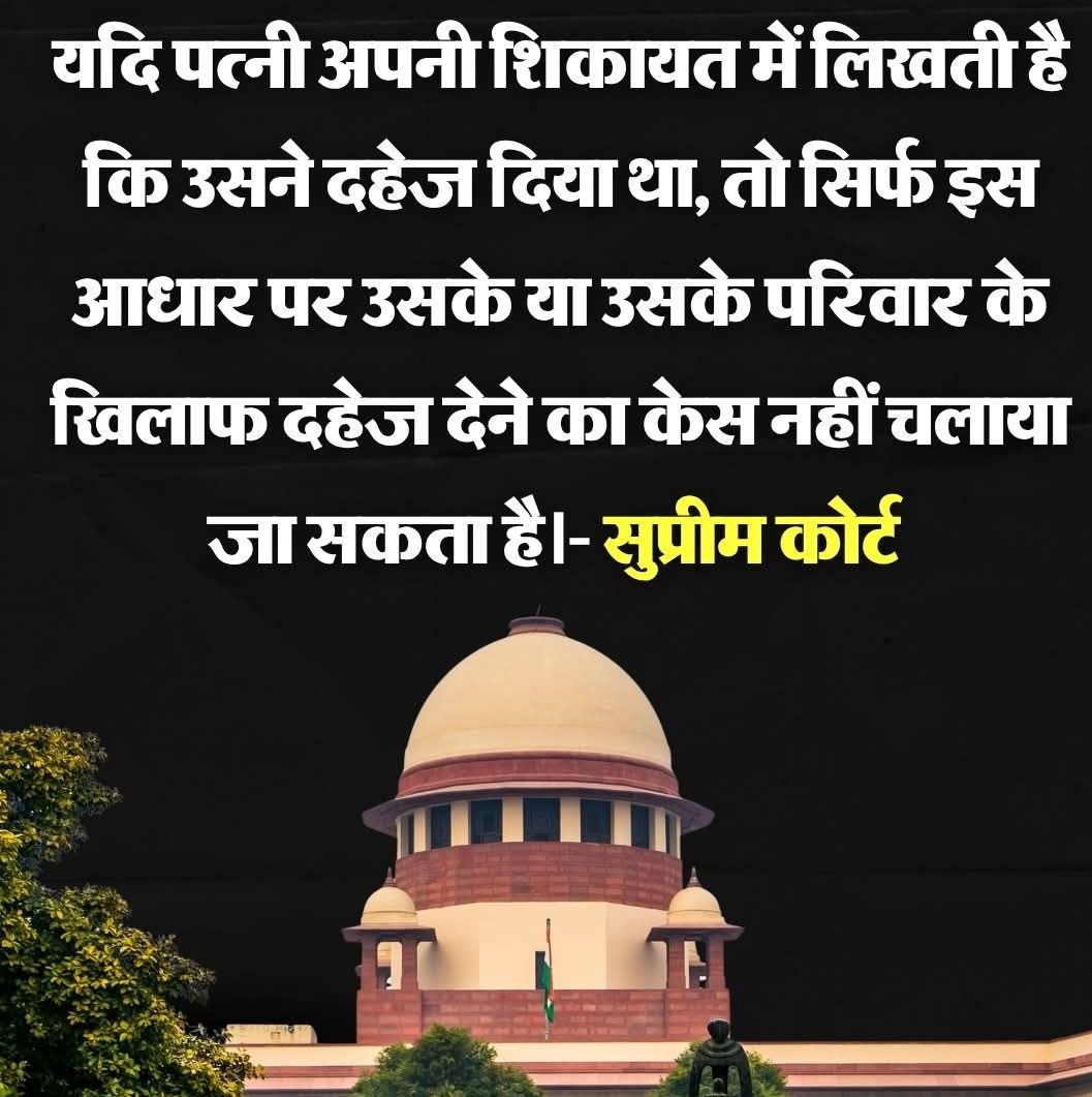 सुप्रीम कोर्ट ने दहेज मामलों में स्पष्ट किया है कि यदि पत्नी अपनी शिकायत में लिखती है कि उसने दहेज दिया था, तो सिर्फ इस आधार पर उसके या उसके परिवार के खिलाफ दहेज देने का केस नहीं चलाया जा सकता है।
