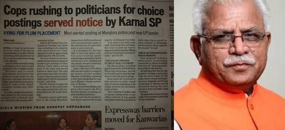 Ten years old post by Journalist Vishal Joshi still remains unanswered.It was Pankaj Nain SP now IG Ambala .Karnal SP admits cops putting political pressure for choiced postings at bribe-prone places. It is interesting that a police officer exposing the known nexus and issues notices to cops. But important part is to reveal the politicians identity supporting in district of the chief minister Manohar lal Khattar. Can Khattar, who claims corruption free administration, act on the issue?
