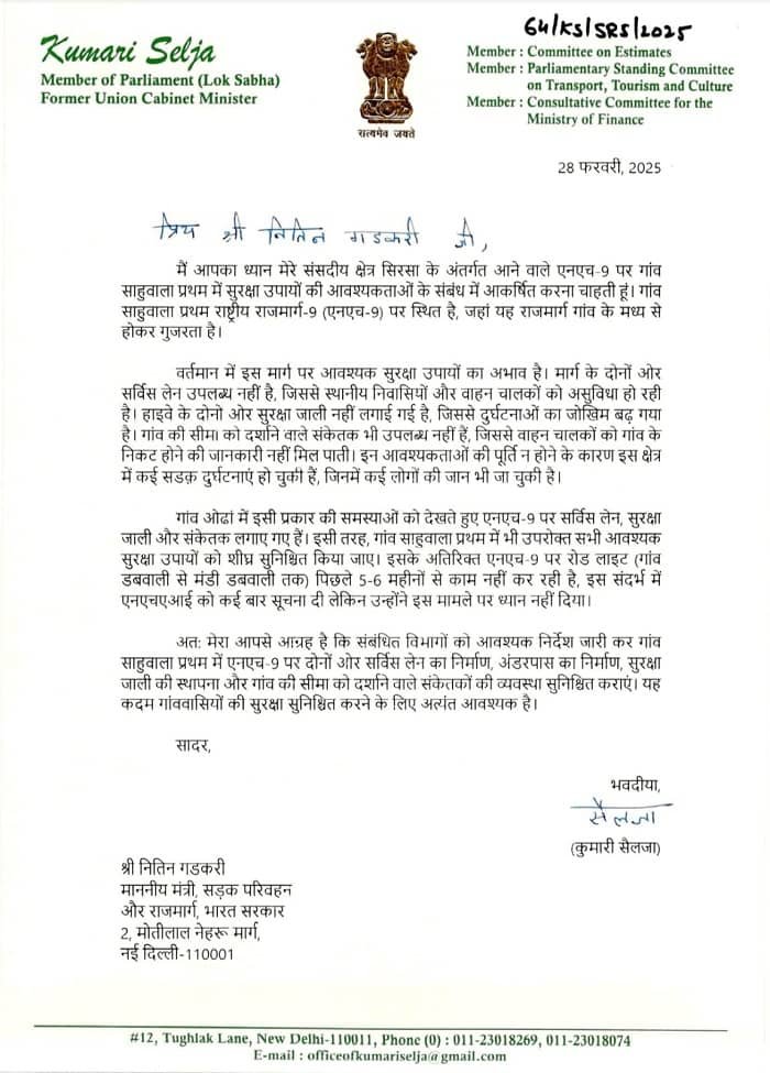 सांसद कुमारी सैलजा ने केंद्रीय सड़क परिवहन और राजमार्ग मंत्री नितिन गडकरी को पत्र लिखकर अनुरोध किया है था कि उनके संसदीय क्षेत्र की जनता के हितों को ध्यान में रखते हुए एनएच-9 स्टोन नंबर 132-133 के बीच माजरा रोड फतेहाबाद पर और हिसार-सिरसा एनएच-9 पर सीएच नंबर 221+700 पर अंडर पास का निर्माण करवाया जाए। इन स्थानों पर बने कट के कारण आए दिन सड़क हादसे होते रहते है और जानमाल का नुकसान होता है, अंडर पास बनने से लोगों को आने-जाने में कोई परेशानी नहीं होगी। नितिन गडकरी ने उक्त पत्र पर संज्ञान लेते हुए अंडर पास निर्माण के लिए संबधित अधिकारियों को पत्र प्रेषित कर दिया है।