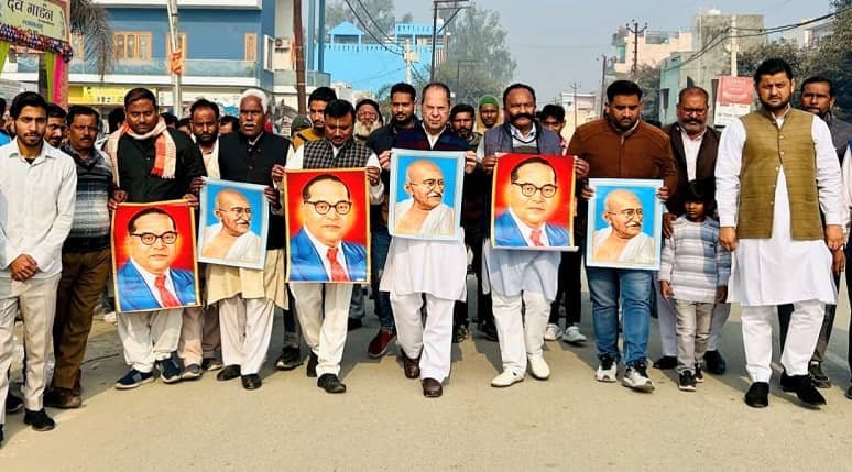 रामपुर: कांग्रेस नेताओं ने ज़िला अध्यक्ष धर्मेन्द्र देव गुप्ता के नेतृत्व मे धमोरा में जय बापू, जय भीम, जय संविधान पैदल मार्च निकालकर जय सविधान के नारे लगाए बाब साहेब अमर रहे महात्मा गांधी अमर रहे के नारे लगाए