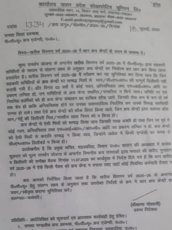 अम्बेडकरनगर। उत्तर प्रदेश के अम्बेडकरनगर जिले में धान क्रय केंद्रों की स्थापना में पारदर्शिता के सरकारी दावे पूरी तरह ध्वस्त होते दिख रहे हैं। जिला स्तर पर ए.आर. कोऑपरेटिव राघवेंद्र प्रताप शुक्ला पर गंभीर आरोप लगे हैं कि उन्होंने शासनादेश की खुलेआम अवहेलना करते हुए उन्हीं समितियों पर केंद्र खोल दिए, जिन पर पहले से एफआईआर दर्ज है या सचिव गबन के मामलों में आरोपी हैं।