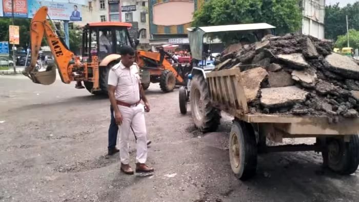 नीलम फ्लाईओवर पर जाम की परेशानी को दूर करने के लिए सोमवार को ट्रैफिक पुलिस की ओर से सड़क पर बने गड्ढों को भरा गया। इन गड्ढों में मलबा डाला गया, जबकि नगर निगम मुख्यालय यहां से 50 मीटर की दूरी पर है।