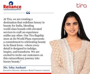 इस मौके पर रिलायंस रिटेल वेंचर्स लिमिटेड की कार्यकारी निदेशक, ईशा अंबानी ने कहा, “टीरा भारत में सौंदर्य और विलासिता को नए सिरे से परिभाषित कर रहा है। यह विश्व स्तरीय ब्रांडों और सिग्नेचर सर्विस के साथ एक अनोखा अनुभव प्रदान करेगा। जियो वर्ल्ड प्लाजा में हमारा फ्लैगशिप स्टोर इस अनुभव को प्रेरित करने, लोगों को जोड़ने और बदलाव लाने के लिए डिजाइन किया गया है। हम अपने ग्राहकों को लक्जरी ब्यूटी की इस असाधारण यात्रा पर ले जाने के लिए तैयार हैं।”