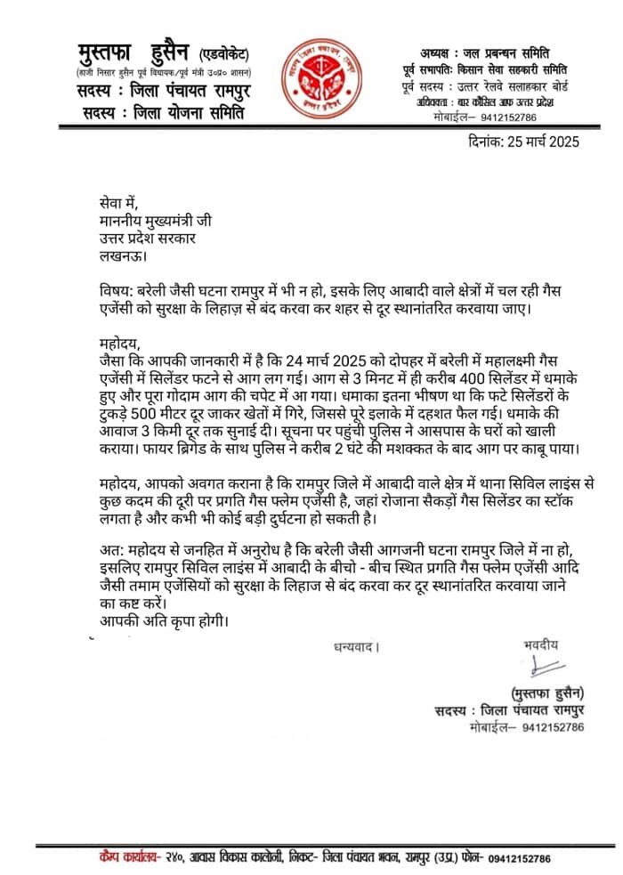 जिला पंचायत सदस्य मुस्तफा हुसैन ने मुख्यमंत्री को लिखे पत्र में अवगत कराया है कि 24 मार्च 2025 को दोपहर में बरेली में महालक्ष्मी गैस एजेंसी में सिलेंडर फटने से आग लग गई। आग से 3 मिनट में ही करीब 400 सिलेंडर में धमाके हुए और पूरा गोदाम आग की चपेट में आ गया। धमाका इतना भीषण था कि फटे सिलेंडरों के टुकड़े 500 मीटर दूर जाकर खेतों में गिरे, जिससे पूरे इलाके में दहशत फैल गई। रामपुर जिले में भी आबादी वाले क्षेत्र में थाना सिविल लाइंस से कुछ कदम की दूरी पर प्रगति गैस फ्लेम एजेंसी है, जहां रोजाना सैकड़ों गैस सिलेंडर का स्टॉक लगता है और कभी भी कोई बड़ी दुर्घटना हो सकती है।