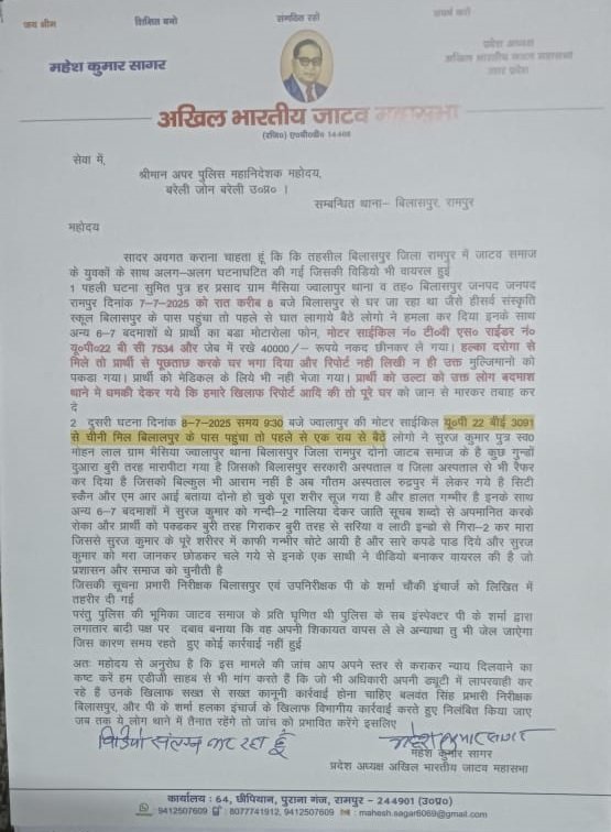 रामपुर। तहसील बिलासपुर, जिला रामपुर में जाटव समाज के दो युवकों पर हुए जानलेवा हमले और पुलिस की कथित लापरवाही के खिलाफ आवाज बुलंद करते हुए अखिल भारतीय जाटव महासभा के प्रदेश अध्यक्ष महेश कुमार सागर ने श्रीमान अपर पुलिस महानिदेशक, बरेली जोन को शिकायती पत्र भेजकर उच्चस्तरीय जांच की मांग की है।