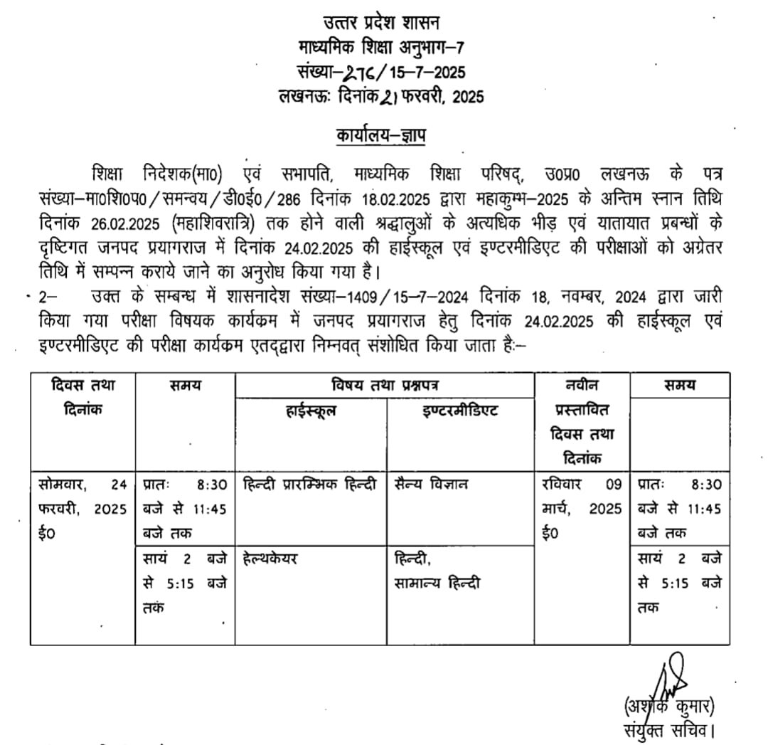 प्रयागराज में यूपी बोर्ड की 24 फरवरी की परीक्षा स्थगित, 9 मार्च को होगी आयोजित