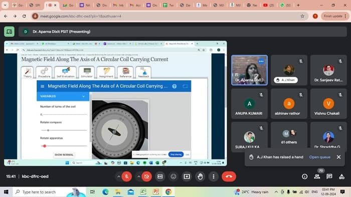 कार्यशाला के संयोजक डॉ संजीव राठौर ने जानकारी दी कि महात्मा ज्योतिबा फूले रोहिलखंड विश्वविद्यालय बरेली द्वारा निर्गत पाठ्यक्रम पर आधारित बीएससी द्वितीय वर्ष के तृतीय सेमेस्टर के प्रयोग कराए गए। मुख्य व्याख्याता के रूप में पीएसआईटी कानपुर की भौतिक विज्ञान की प्रोफेसर और वर्चुअल लैब आईआईटी कानपुर की समन्वयक डॉ अपर्णा दीक्षित ने कार्यशाला में देश के कई राज्यों के प्रतिभागी विद्यार्थियों तथा भौतिक विज्ञान के प्राध्यापकों के मध्य वर्चुअल माध्यम से मैग्नेटिक फील्ड अलोंग एक्सिस ऑफ ए सर्कुलर कॉइल कैरिंग करंट तथा टैजेट गैल्वानोमीटर नामक दो प्रयोगों पर विस्तृत व्याख्यान दिया। तथा व्याख्यान के अंत में प्रतिभागियों के सवालों का बखूबी समाधान भी किया।