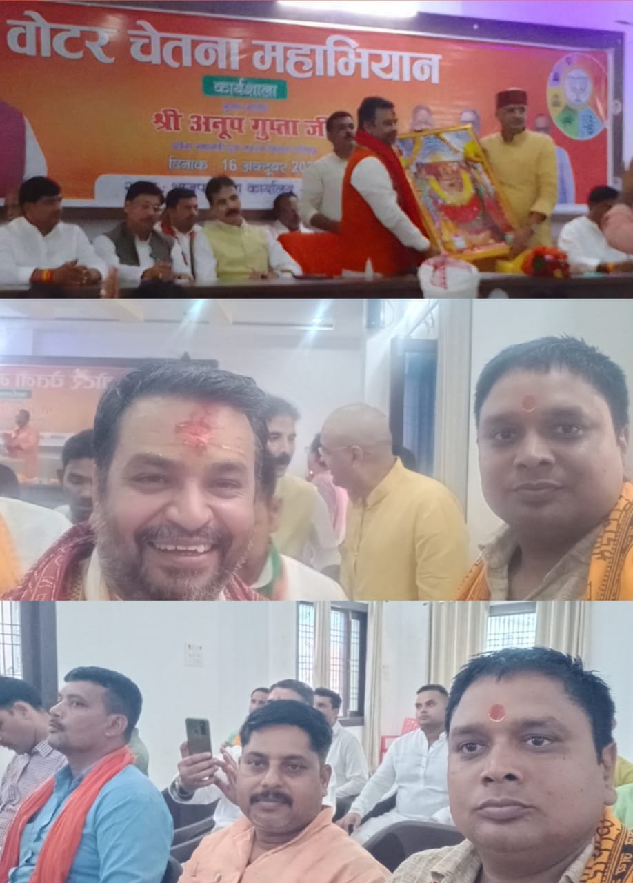 मिर्जापुर। 16 अक्टूबर सोमवार को भारतीय जनता पार्टी के बरौधा स्थित कार्यालय पर वोटर चेतना महाअभियान कार्यशाला का आयोजन किया गया। जिसके मुख्य अतिथि भारतीय जनता पार्टी के प्रदेश महामंत्री एवं विधान परिषद के सदस्य अनूप गुप्ता रहे। इस अवसर पर पूर्व मंत्री एवं मड़िहान विधायक रमाशंकर सिंह पटेल एवं नगर विधायक रत्नाकर मिश्रा एवं भारतीय जनता पार्टी के जिला अध्यक्ष बृजभूषण सिंह एवं चुनार विधायक अनुराग सिंह एवं विधान परिषद सदस्य विनीत सिंह एवं मीरजापुर सोनभद्र सहकारी समिति के चेयरमैन जगदीश सिंह सहित सभी पार्टी के पदाधिकारी एवं कार्यकर्ता उपस्थित रहे।